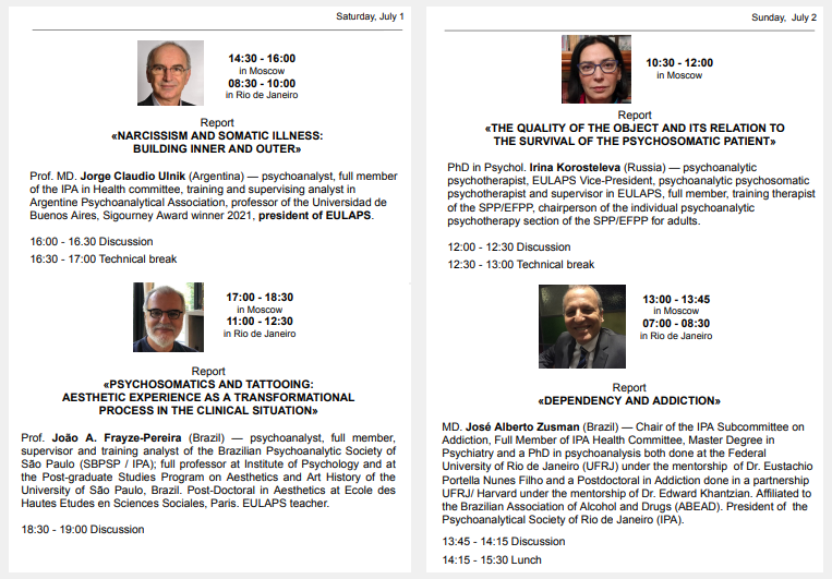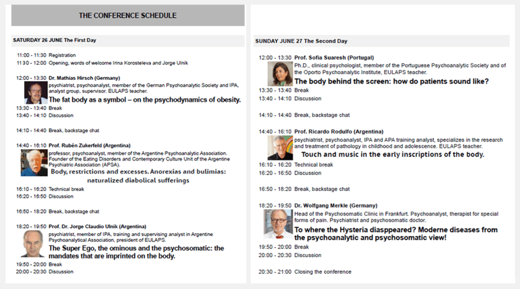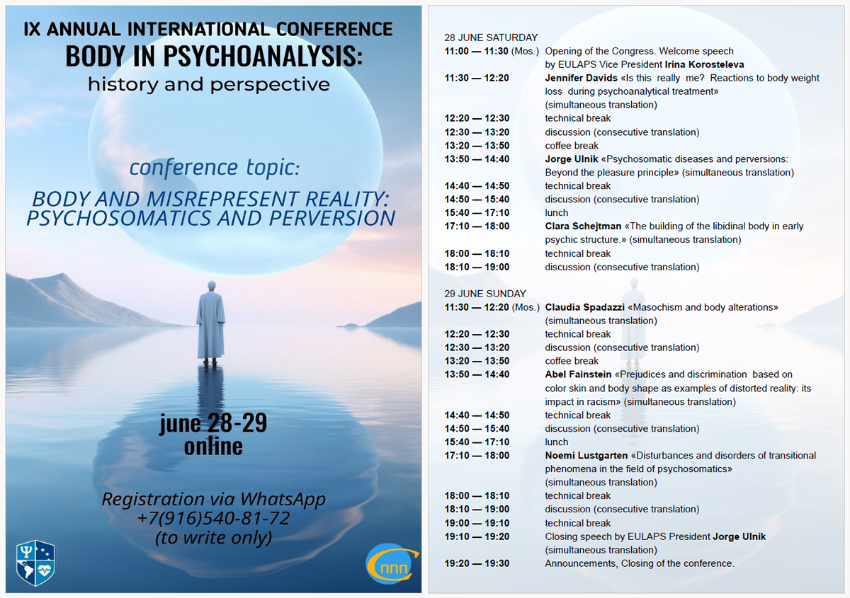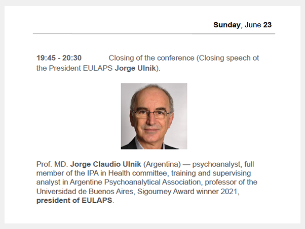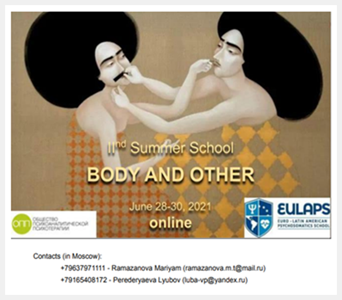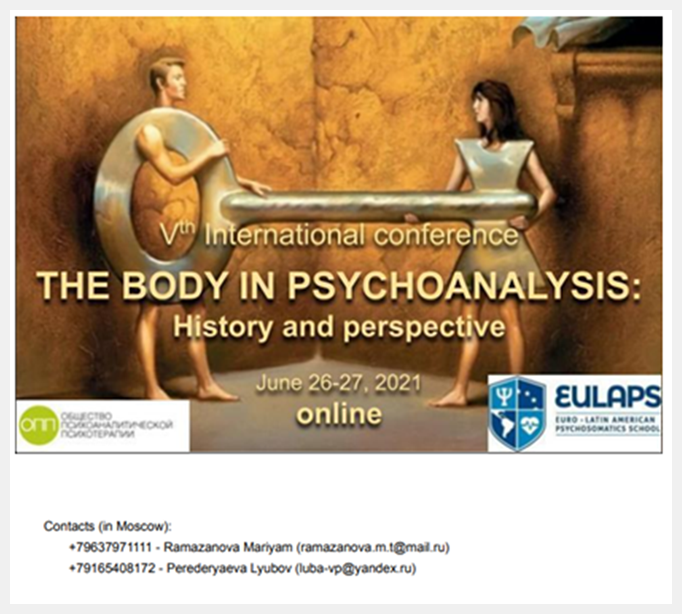 -Participación como expositor en la Vth International Conference, organizado por EULAPS: “The body in psychoanalysis: history and perspective”. Título de la presentación: “The Super Ego, the ominous and the psychosomatic: the mandates that are imprinted on the body”. Realizada vía online los días 26 y 27 de junio, 2021.