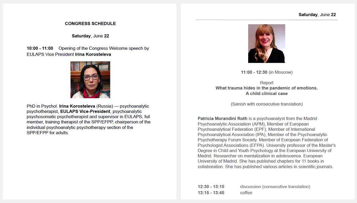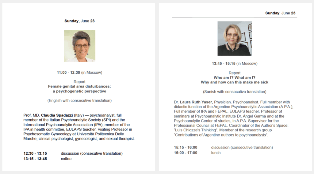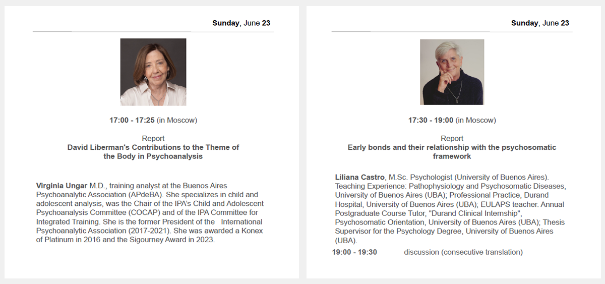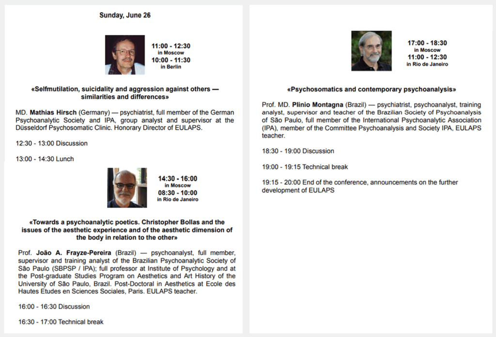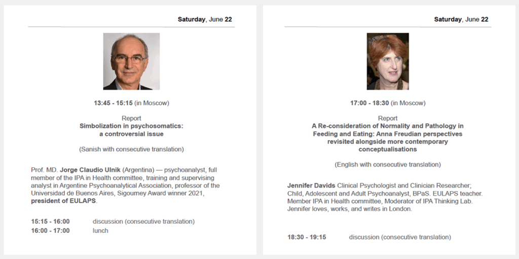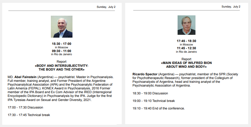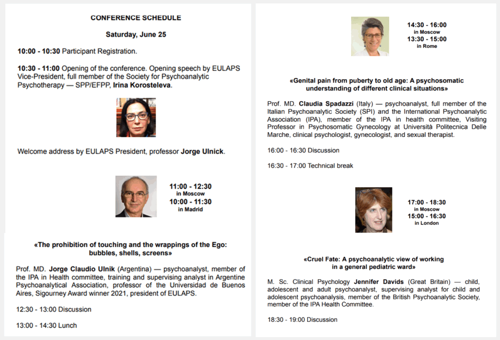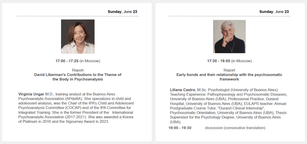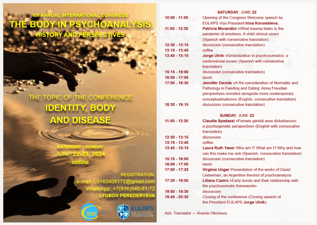 – Participación como expositor. Título de la presentación: “The prohibition of touching and the wrappings of the Ego: bubbles, shells, screens”. En Moscú, los días 25 y 26 de junio, 2022.
